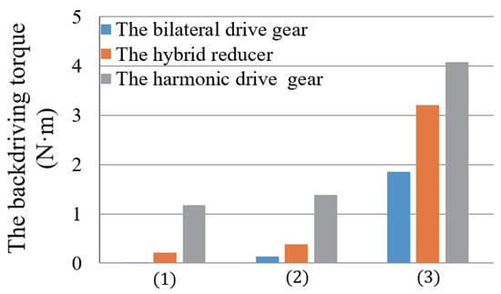 Backdrivability is a critical criterion for wearable exoskeletons. It is a measure of how easily a torque applied on the output axis inversely drives the input axis and the motor []. Therefore, for the exoskeleton to be driven backward, the wearer has to overcome the rotation resistance of the exoskeleton and drive the exoskeleton to move. In other words, large rotation resistance impairs the backdrivability.