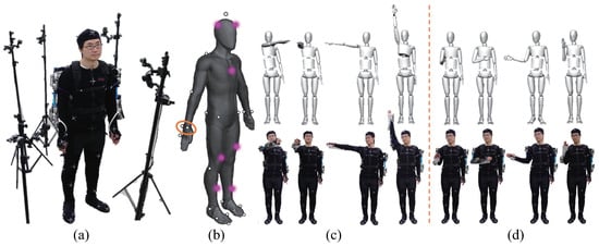 (a) experimental setup and overview of the motion capture; (b) marker locations; (c) measurement of the shoulder joint workspace; (d) measurement of the elbow joint workspace.