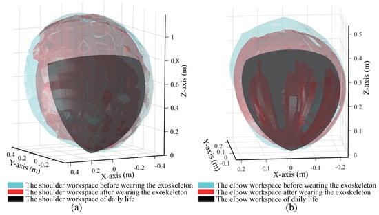 The backdrivability guarantees the flexibility of the active joints when the exoskeleton is not under control. However, further verification is required to determine whether the joint design of the exoskeleton can meet the wearer’s needs for the workspace. This section describes the evaluation of the designed workspace of the exoskeleton and the wearer’s actual workspace before and after the exoskeleton is worn.