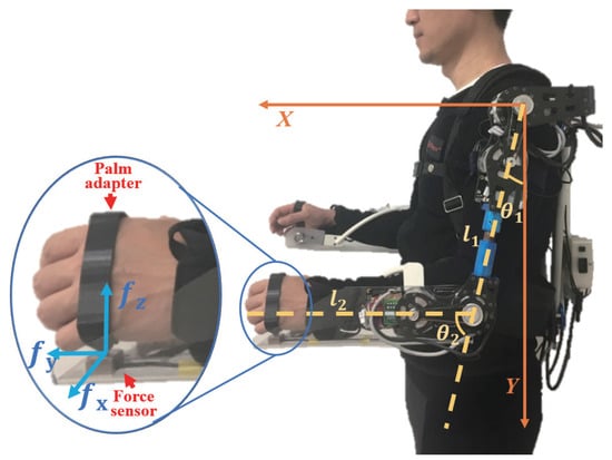 Furthermore, the force signals were converted into the torque signals ( and ) of the elbow and shoulder joints for the wearer’s exoskeleton by using Equation (3) and the Jacobian matrix (Equation (4)):
