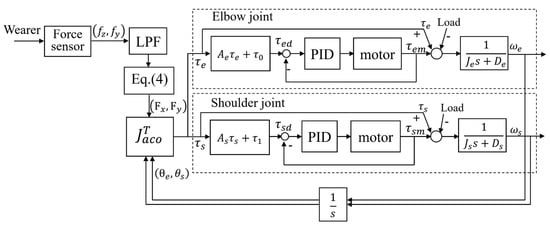 Figure 8 displays the block diagram of the control system. The output torque of the active joint is transmitted to the object through the exoskeleton in order to achieve power assistance. From the equation, the coefficients  and  were used to tune the output torque and adjust the power-assist ratio of the exoskeleton. Simultaneously, the force applied by the wearer on the force sensor is also transmitted to the object through the exoskeleton. The power assistance can be realized through the joint action of the wearer and the exoskeleton.