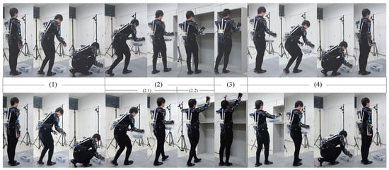 Unlike carrying an object to the 1.2 m high, carrying the object to the 1.8 m high requires a larger movement range, and the wearer naturally divides the movement of the second stage into two steps during the carrying process. First, (stage (2.1)), the wearer picks up the heavy object and approaches the shelf; subsequently (stage (2.2)), the wearer lifts the heavy object over his or her head in front of the shelf and proceeds to place it on top of the shelf.