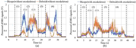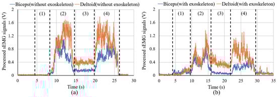 sEMG signals for carrying a load to the 1.2 m high for subject A. (a) is the results of sEMG signals of biceps and deltoid without exoskeleton. (b) is the results of sEMG signals of biceps and deltoid with exoskeleton.