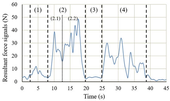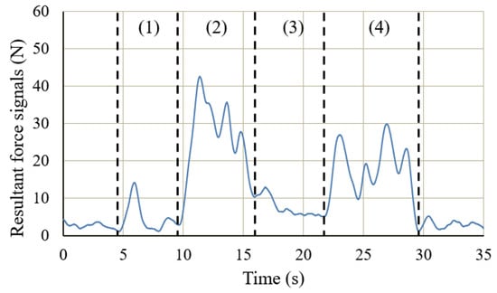 The second and fourth stages corresponded to the actions of lifting and lowering the heavy object, which bore the greatest load during the carrying process. Therefore, Equations (6) and (7) were used to calculate the results of the average sEMG signal and the average resultant force signal in Table 4 at these two stages.  and  are the start time and end time of these two stages, respectively: