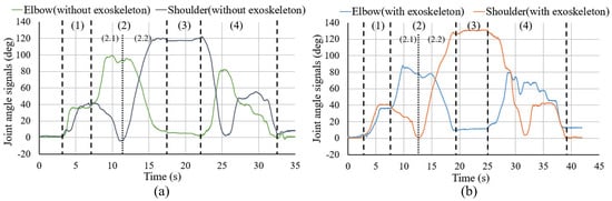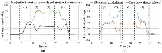 Joint angle signals for carrying a load to the 1.2 m high for subject A. (a) is the results of joint angle signals of elbow and shoulder without exoskeleton. (b) is the results of joint angle signals of elbow and shoulder with exoskeleton.