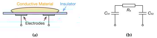 Schematic model of electrodes capacitively coupled to a conductive material via a thin insulator: (a) cross-sectional diagram; (b) equivalent circuit.