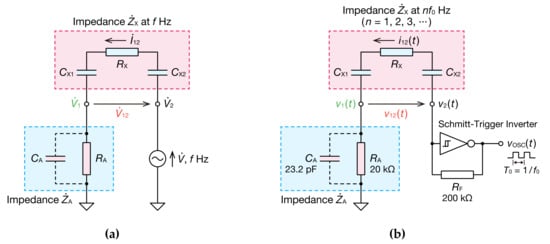 where and are the complex voltage and complex current of , respectively, is the complex voltage of , and is the combined impedance of resistance and parasitic capacitance . Based on this idea, in the present study, we obtained the frequency characteristics from the voltage signal of a non-sinusoidal oscillator. For the non-sinusoidal oscillator, including the capacitive coupling, we used a Schmitt trigger inverter oscillator. This oscillator does not have high precision for the oscillation frequency, but features a small number of parts and stable oscillation; thus, it makes for a small, cheap, and easy-to-handle system. Figure 2b shows the prepared oscillator. is a resistive element, which is the measured object, and and are the capacitive-coupling parts of the insulators and electrodes. Because , the capacitive couplings are considered to be incorporated into the oscillator as a capacitance . The resistive elements may also include a capacity component. However, in the present study, we assumed that there is only a resistive component for the sake of simplification. For the Schmitt trigger inverter integrated circuit (IC), we used a readily available 74HC14AP, and the power supply voltage of the IC was 5 V. The resistance for measuring the current is . Parasitic capacitance combines with . The discharge and charge of the capacitor connected on the input side of the Schmitt trigger inverter switched the high and low levels of the voltage , which led to the non-sinusoidal oscillation of the voltage and . If parasitic capacitance can be ignored, the oscillation frequency can be expressed with the following: