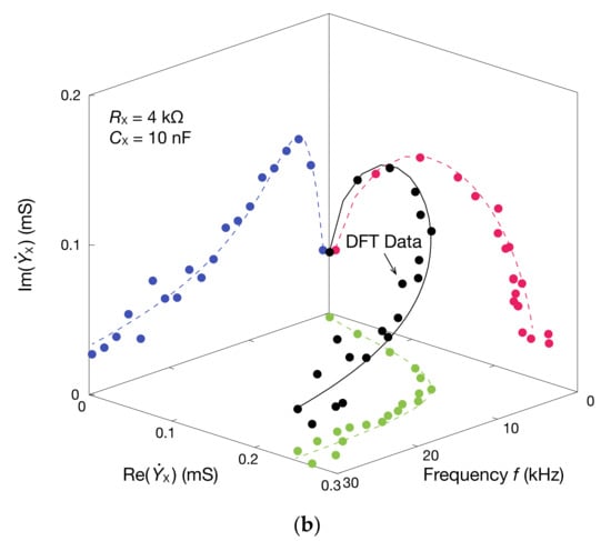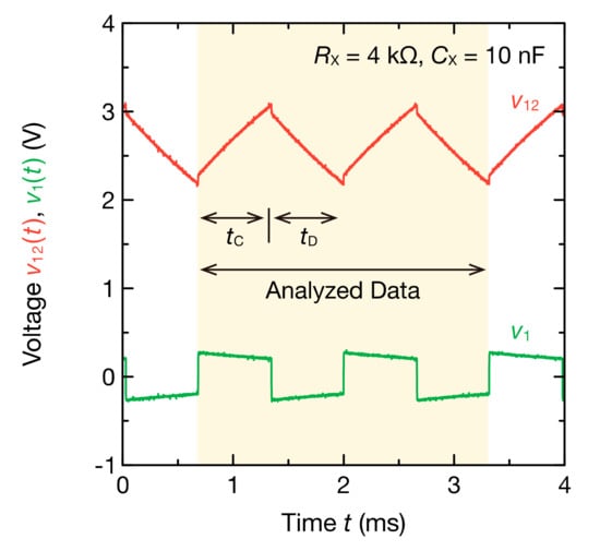 The time waveform data of the voltage were collected using a digital oscilloscope (OWON VDS3104L). and in Figure 2b were measured, and the time waveform data of was obtained from their difference. Then, we transformed DFT for two cycles ( = 1.0 nF or 10 nF) or four cycles ( = 0.10 nF) of the time waveform data. The time waveform data was divided by a certain number of data points, and DFT was performed for each cycle. We averaged each DFT result. For the window function of DFT, we used a rectangular window. From the obtained DFT data, we obtained real and imaginary parts for following the steps discussed in Section 2.2. and were estimated using the least-squares method.