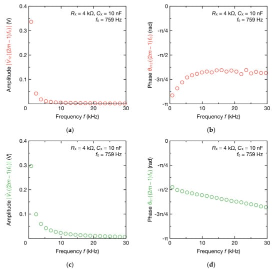 Frequency spectra of: (a) amplitude ; (b) phase ; (c) amplitude ; and (d) phase at ( ) Hz. The spectra were obtained using DFT from the two-cycle segment of and in Figure 3. The and were set to 4.0 kΩ and 10 nF, respectively.