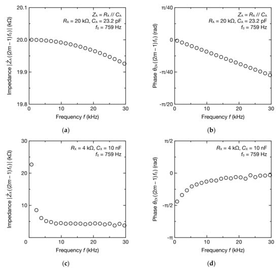 are obtained. Thus, the amplitude and phase spectrum, and , of unknown impedance are obtained with Equations (16) and (17) using the amplitude and phase spectra of , , and :