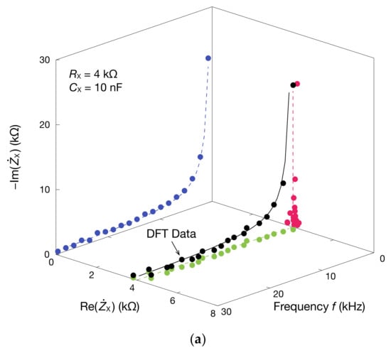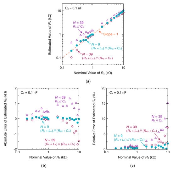 With the proposed method, we could estimate in the range of 0.90 to 10.0 kΩ and of 10 or 1.0 nF with accuracy. If is smaller than 0.90 kΩ or is 0.10 nF, the estimate was less precise. This likely has an impact on the parasitic impedance in wires and circuit boards, in addition to the and . Thus, to improve the precision for low resistance and capacitance, we determined a more detailed equivalent circuit model of from the Cole–Cole plot of when 0.10 nF and 0 Ω. When was known, was obtained with and with DFT using Equation (24):