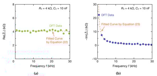 Frequency spectra of: (a) real part ; and (b) imaginary part of impedance . The DFT data were fitted to Equations (22) and (23) for determining and (dashed lines).