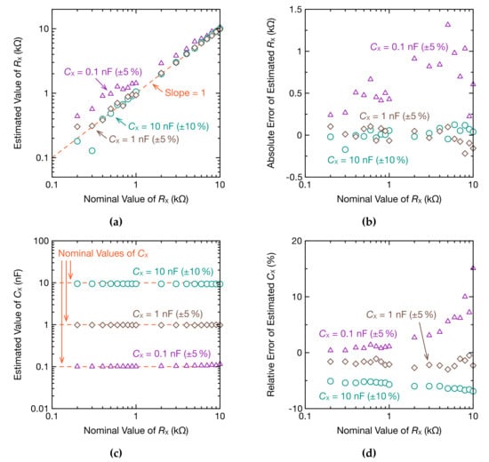 Next, using the obtained circuit parameters, and were estimated again (Figure 10). When estimated from odd harmonics to the 39th order, by considering both and , the precision of the low-resistance estimate was improved. However, there was less improvement in high-resistance values (Figure 10a,b). A similar trend was observed in the estimates of (Figure 10c). This indicates that, at higher frequencies, the parasitic capacitance of and a breadboard cannot be ignored. Therefore, we limited the frequency for the estimate to odd harmonics of up to 500 kHz ( 9) and found that the estimate precision was also improved in higher resistance values. When was 10 or 1.0 nF, the precision did not change, even taking and into consideration. Therefore, by optimizing the equivalent circuit model of and keeping the frequency of the higher harmonic wave to 500 kHz or below, estimates of low resistance and low capacitance could be improved. When the frequency of higher harmonic waves is limited, the number of data points for fitting is low when the oscillation frequency is high, which is a problem when estimating a complex circuit’s impedance. However, because Schmitt trigger oscillators can change the oscillation frequency with , measurements with multiple enable a sufficient number of data points.