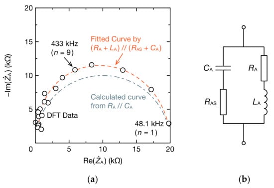 Figure 9a shows the Cole–Cole plot of . The DFT data creates a capacitive semicircle and is under the notable impact of and . However, there is a discrepancy between a curve calculated from 20.0 kΩ and 23.2 pF only () and DFT data, indicating that there is parasitic impedance other than and in . As in Figure 9b, when a curve fitting was performed for an equivalent circuit model that considers parasitic resistance and parasitic inductance , in addition to and (), the result was consistent with the DFT data. Each parameter of the equivalent circuit was 20.017 kΩ, 378.761 Ω, 4.705 mH and 35.416 pF. For , there are possibilities of resistance from the wiring pattern of the circuit board and contact resistance, but because is too large as a parasitic inductance, a separate interpretation of is needed.