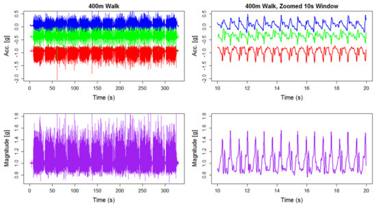 Triaxial accelerometer data from the 400 m walk for a single individual (top left) and a zoomed 10 s window (top right). Vector magnitude from the 400 m walk for same individual (bottom left) and zoomed 10 s window (bottom right).