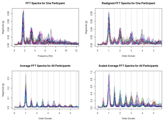 For each spectrum obtained, we then identify the fundamental frequency (cadence) as the location of the largest peak in the spectrum. Since the reported frequency of walking is between 1.4 and 2.5 Hz [23], which corresponds to 1.4 to 2.5 steps per second, we look for the cadence in a conservative range of 1.2–4.0 Hz to be consistent with Urbanek et al. [15]. The frequency axis used is from 0 to 39.9 Hz sampled every 0.1 Hz which ensures every individual’s spectra will contain at least 10 multiples of their dominant frequency, or cadence. In the top left panel of Figure 2, we display all spectra for a single participant. Although these spectra appear similar, it is evident that there is variability between spectra obtained in different windows. Therefore, once the spectra are all obtained, and we have identified their fundamental frequencies, it is imperative that we align each spectrum for aggregation.