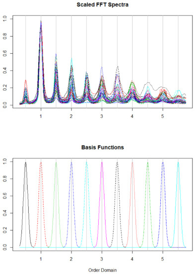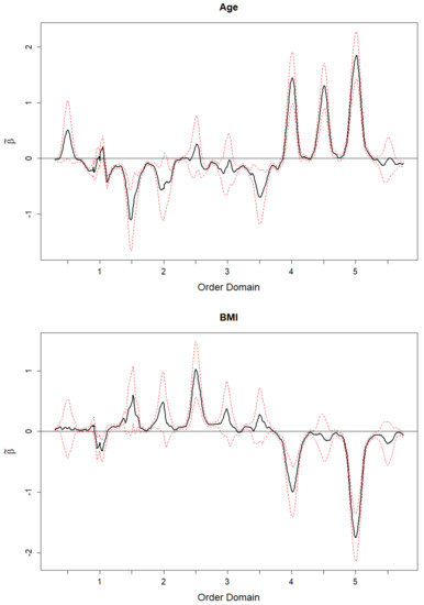 We applied the methods discussed in Section 3 to the data described in Section 2 to study the associations of walking spectra obtained from the fast-paced 400 m walk with age and BMI [3]. The fast-paced 400 m walk is often used in epidemiological studies of older adults to assess aerobic fitness [25]. The most common protocol implemented for the fast-paced 400 m walk is the long distance corridor walk (LDCW) [26]. The pre-processed walking spectra described in Section Figure 2 were each sampled at distinct sampling points within 0.3 and 5.75 of the order domain. This range was chosen because there is little energy contained in the spectra beyond 13.5 Hz. Assuming an average cadence of 2.0 Hz, this range sufficiently covers the relevant features of walking. There were participants that completed the LDCW. In addition to each participant’s scaled average walking spectra, an estimate of their average cadence was used as a predictor in the proposed models to control for participant-specific walking speeds. In addition, was used to control for the energy magnitude each participant produced. For example, an individual with a very controlled and smooth walking style would have shown lower magnitude than an individual with a heavy stomp in their walk. We also adjusted each model for gender differences.