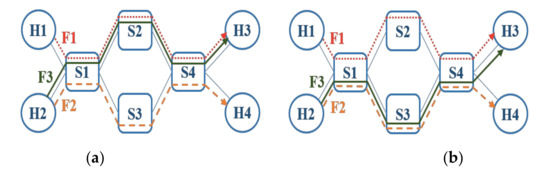 It can be seen from Section 3.1 that time-critical flows with higher hyperperiods lead to higher computation times for scheduling as more numbers of checking is needed [10]. Thus, it can be argued that the computation time for scheduling can be decreased if the time-critical flows with small hyperperiods are routed on the same edges as much as possible. This can be illustrated by using an example shown in Figure 2 where a network with 4 switches, 4 hosts, and 3 flows is assumed. Furthermore, the periods of flows F1, F2 and F3 are 20, 30 and 10 ms respectively, whereas the hyperperiod of F1 and F3 is 20 ms and that of F2 and F3 is 30 ms. Moreover, in this example, we assume two routing schemes for the flow F3 shown in Figure 2a,b, respectively, wherein Figure 2a the route for F3 includes edges [H2, S1], [S1, S2], [S2, S4], and [S4, H3] whereas in Figure 2b the route for F3 contains edges [H2, S1], [S1, S3], [S3, S4], and [S4, H3]. The sending time of two different flows are checked up to the LCM on the edge in the time domain for conflict-free scheduling. For the scheme shown in Figure 2a, F1 and F3 on the edge [S1, S2] and the edge [S2, S4] are checked by two times, while for the scheme of Figure 2b, F2 and the F3 on the edge [S1, S3] and the edge [S3, S4] are checked by three times. Therefore, the number of times for the checking and the computation time in scheduling is smaller for the scheme of Figure 2a than that for Figure 2b.