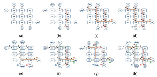 The example that illustrates the operation of the proposed algorithm. (a) The mesh topology with 9 switches and 6 hosts. (b) The shortest path of the flow F1. (c) The path with the minimum cost of the flow F2. (d) The result of routing the flow F3 with visited nodes, source node, and the destination node. (e) The result of updating the weight of each edge along the path of flow F3. (f) The result of routing the flow F4 with visited nodes, the source node, and the destination node. (g) The result of computing the weight of each edge where the flow F4 passes through. (h) The result of rerouting the flow F4 with all nodes in the topology.