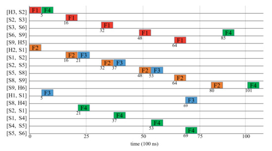 Figure 6 presents the sending time of each flow on nodes along the path resulted from the proposed routing algorithm. It can be observed from this figure that each flow passes through edges along the path sequentially. For example, the flow F3 passes through edges [H1, S1], [S1, S2], [S2, S5], [S5, S8], and [S8, H4] sequentially. In addition, it can be seen that the proposed routing algorithm attempts to make the F3 pass through visited nodes such as the edges [S1, S2], [S2, S5], [S5, S8] that are also visited by F2. In other words, the F2 is assigned to the unused time slots on the visited edges, and those unrouted flows which would cause the dramatic increase in the edge weight can use reserved edges. For example, the flow F4 is able to be routed with edges [S2, S1], [S1, S4], [S4, S5], [S5, S6].