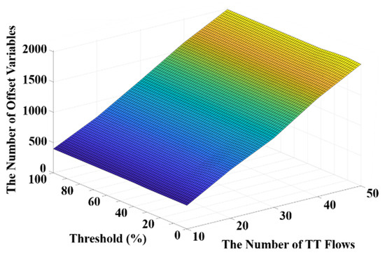 Experiments are conducted to evaluate the impacts of the threshold value to the proposed algorithm from the perspectives of offset variables, the computation time for routing and scheduling, the overall edge weight. Our experiments are based on the network topology Orion [6] consisting of 31 end systems and 15 switches. The size for each flow is configured between 1 and 8 times MTU, whereas the period sets are {10, 20 ms}, {5, 10, 210, 500 ms}, and {2500, 3300, 5000, 6600 µs}. These configurations of flow sizes and period sets are referred to [10]. The source node and the destination node of each flow are determined randomly and the scheduling optimization options are latency minimization, queue usage minimization, and no optimization. Furthermore, as the hyperperiod of flows affects the computation time in scheduling [10], we conduct the threshold experiment with complex period sets to observe the effect of the large hyperperiod on the proper selection of the threshold. Figure 7 presents frame offsets of a flow (i.e., the sending time of frames on each node along the route of the flow) with different thresholds and different numbers of flows. Specifically, a higher offset value indicates a longer route of the flow. It can be observed from Figure 7 that the offset value increases significantly with an increased number of flows, whereas the value of the threshold does not have a significant impact on the offsets.