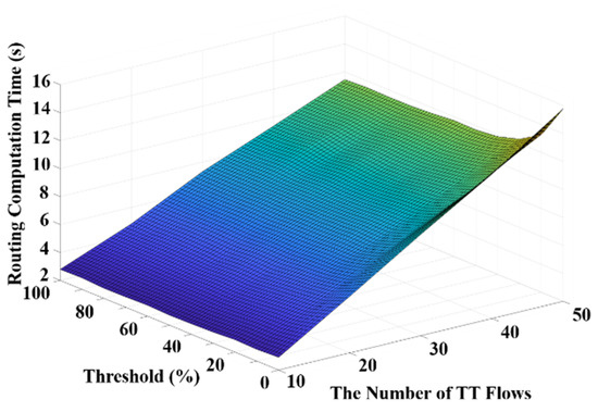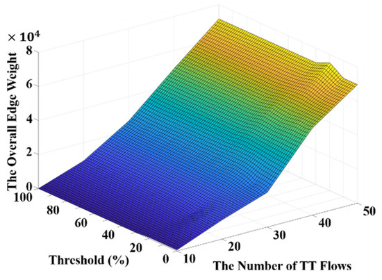 Furthermore, the average computation time in routing with different thresholds and different numbers of flows is shown in Figure 8. It can be observed in Figure 8 that the computation time of routing drastically increases if the threshold becomes too low. This is because the threshold value basically determines if a flow should be re-routed and thus a lower threshold leads to more re-routing and increases the computation time. On the other hand, it is shown in Figure 8 that the computation time of routing increases along with the number of flows at any given threshold value. Moreover, the average computation time in scheduling with different thresholds and different numbers of flows is presented in Figure 9. It is shown in Figure 9 that the computation time in scheduling is generally lower when the threshold is smaller than 20%. Based on the experimental results illustrated in Figure 8 and Figure 9, a trade-off between the computation time in scheduling and routing can be witnessed. Therefore, considering the overall computation time including both scheduling and routing, the threshold value of 10% could be a proper selection. In addition, the overall edge weights with different thresholds and different numbers of flows are presented in Figure 10. It can be seen that the overall edge weight with the threshold value of 20% is greater than the other threshold values when the number of flows is 50. Therefore, the computation time in scheduling is higher than the others when the threshold is equal to 20% with 50 flows as suggested in Figure 9.