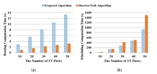 The computation time in routing and scheduling with different numbers of flows is investigated. The network topology, period sets, flow size, and scheduling optimization options are the same as the setup for evaluating the thresholds mentioned in Section 5.1. The source node and the destination node of each flow are determined randomly and the threshold is set to be 10%. Figure 11a shows the comparison of computation time between the proposed routing algorithm and the shortest path algorithm (SPA). It can be seen that the computation time for both algorithms increases linearly with the number of flows in the network. Furthermore, the computation of the proposed algorithm is higher than the SPA approach. Moreover, the computation time in scheduling when utilizing the proposed routing algorithm and the SPA routing algorithm is compared in Figure 11b. It can be seen that the proposed routing algorithm results in a much-reduced computation time in scheduling especially when the number of the flow is increased. Specifically, the proposed routing algorithm reduces the computation time in scheduling by 30% on average compared to the SPA scheme.