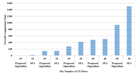 In addition, it can be observed from Figure 11 that the proposed routing algorithm reduces the computation time in scheduling at the cost of greater computation time in routing. To shed more light on the overall computation time for network planning, it is essential to evaluate the computation time by jointly considering routing and scheduling. Figure 12 compares the computation time in joint routing and scheduling between the proposed routing algorithm and the SPA approach. In other words, the computation time shown in Figure 12 is by adding the computation time shown in Figure 11a with that shown in Figure 11b. It can be observed from this figure that the proposed algorithm can reduce the overall computation time through the tested numbers of flows. Moreover, as the complexity and computation time in scheduling increases significantly with the number of flows, the advantage of the proposed routing algorithm enhances with a greater network.