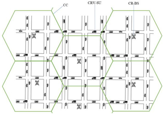 This paper’s emphasis is on the efficient allocation of spectrum resources with the assumption that the intelligent detection of spectrum holes [2,13] is carried out in advance. The key aim is to efficiently schedule the dynamically available spectrum resources with the satisfaction of QoS requirements of the CR vehicular secondary users (CRV-SUs), while guaranteeing non-interference of potential communications from the licensed primary users (PUs). Using DSA, CRV-SUs can intelligently detect the presence of spectral white spaces (i.e., available spectrum holes) that are temporarily left under-utilized by the licensed owner (i.e., the PUs), dynamically utilize the available spectrum, and vacate in the instance of the licensed PUs. In this study, a cellular OFDMA-based overlay CR-Assisted Vehicular NETwork scenario is considered, where licensed spectrum owners permit CRV-SUs to access the unused spectral resources, providing the licensed PUs with a guarantee of no performance degradation. Therefore, in an overlay fashion, CRV-SUs are not permitted to access the sub-channels that are under current PU occupation and this ensures that there is no co-channel interference between the PUs and CRV-SUs.