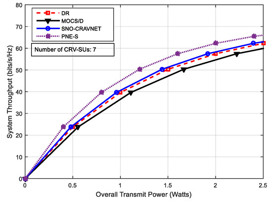 Performance evaluation using the achieved system throughput measured against the overall supplied transmit power with number of Cognitive Radio vehicular secondary users (CRV-SUs) = 14.