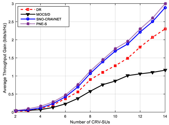 Performance evaluation using the overall achieved average throughput gain measured against the varying number of CRV-SUs.