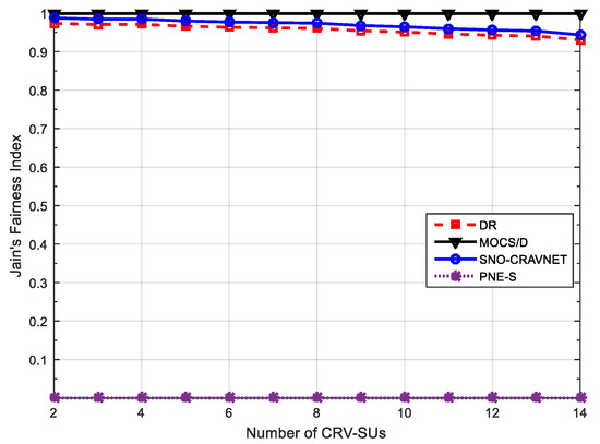 The resource fairness provision was investigated, as depicted in Figure 7, through performance evaluation using JFI measured against a varying number of CRV-SUs. According to [2,33], the JFI is expressed as