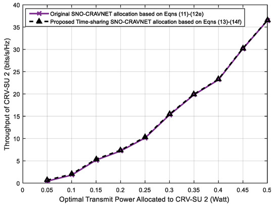 The accuracy of the proposed time-sharing approach is studied in Figure 8 and Figure 9, which depict comparisons of the derived optimal strategies through a combinatorial search within the original optimization problem expressed in Equations (11) and (22)–(27) and the reformulated convex optimization problem presented in Equations (13) and (29)–(34) as discussed in Section 3, respectively. The comparisons were performed with respect to (wrt) the optimal supplied transmit power and achievable optimal throughput of CRV-SU 1 (see Figure 8) and CRV-SU 2 (see Figure 9). Furthermore, for other CRV-SUs, similar results were obtained. As clearly demonstrated in Figure 8 and Figure 9, the transmit power and the achievable optimal throughput values obtained in the case of CRV-SU 1 (see Figure 8) and CRV-SU 2 (see Figure 9) are nearly the same and the performance gaps in both cases are infinitesimally trivial, such as . Therefore, both Figure 8 and Figure 9 show that the proposed time-sharing SNO-CRAVNET allocation based on Equations (13) and (29)–(34) is capable of achieving up to an average of for the total theoretical capacity.