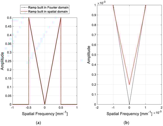The ramp filter in Equation (2) does not include a zero, as shown in the comparison of the two shapes in Figure 2. Filtering with non-zero conditions avoids the zero signals that might have occurred if the filters were used with zero conditions.