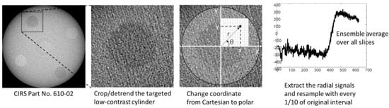 Spatial resolution for each imaging configuration and each filter scheme was evaluated by the MTF measurement of the cylindrical materials as conducted by Richard et al. [19]. After subtracting the two-dimensional planar fit from the original region of interest (ROI) of each targeted cylinder, the radial pixel values around the edge of the circular shape were rearranged to yield a one-dimensional edge spread function (ESF). When converting the image grid from a Cartesian to polar map, the center of each disk was measured on a binary image through a gray-level threshold. The ESF, which is equivalent to the radial profile of the circle, was resampled with one-tenth of the reconstructed pixel size to reduce the non-uniformly distributed pixel noise [20]. The final ESF was derived by averaging the ESFs measured from consecutive axial slices. The MTF was the Fourier amplitude of the derivative of the ensemble-averaged ESF. In addition, the high-frequency noise of the ESF derivative was relieved through a Hanning window having the same length as the ESF size. The overall process of radial MTF measurement is depicted in Figure 3.