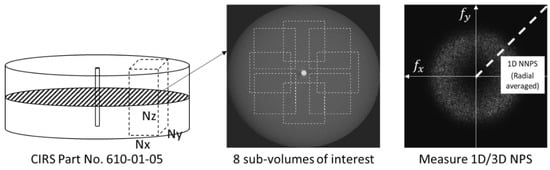 The normalized noise power spectrum (NNPS) was measured to quantify the noise level in the homogeneous volume of interest (VOI) of the poly methyl methacrylate (PMMA) background. The three-dimensional (3D) NPS was measured as described in Figure 4. The eight different VOIs without interference of any structure with the size of 150 × 150 × 45 (300 × 300 × 90 for high-resolution reconstruction) were selected for measuring the 3D NPS. Each sub-volume overlapped with others to evaluate the radially and symmetrically distributed noise property (location independent noise pattern) [21].