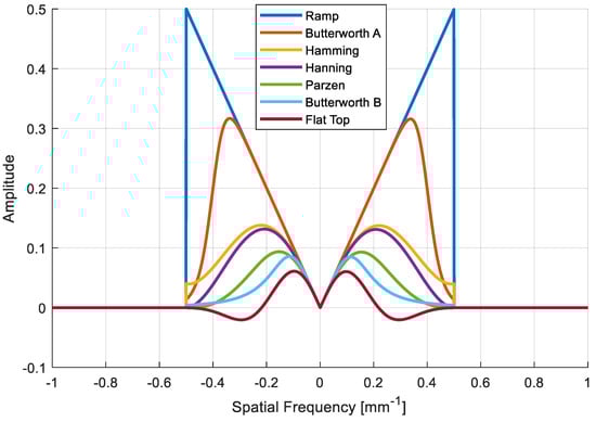 Six different Fourier transformed and band-limited filters designed in the spatial domain with regard to the frequency response are depicted in Figure 5. Because the Fourier transformed sinograms were forced to be band limited with a band width of 0.5, the signals outside of the band frequency range went to zero, as shown in Figure 5. Similarly, each window function was also band limited and multiplied by the band-limited ramp filter. The magnitude of the filter at high frequencies was rejected when going from scheme (a) to (f) in Table 4, which is generally interpreted as noise suppression. Unlike other filters, some of the value of the flat-top window are negative.