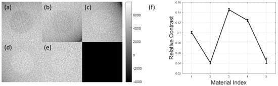 Reconstructed image with configuration (1, 1) using the Hanning window. (a–e) The cropped region of interest (ROI) around the center of each material, and (f) relative contrast between the target and background with standard deviation error bar as a function of each material.