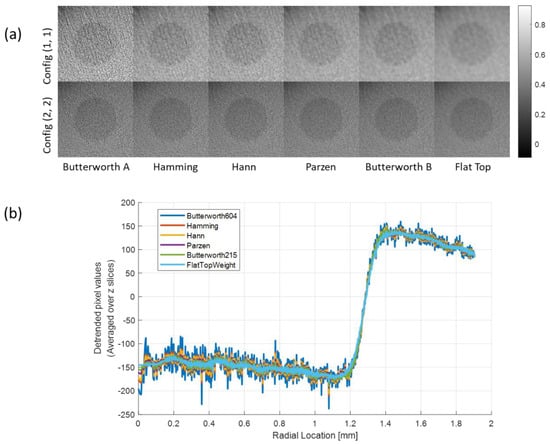 (a) Reconstructed image with different configurations using the Hanning window and (b) the radial profile of each configuration.