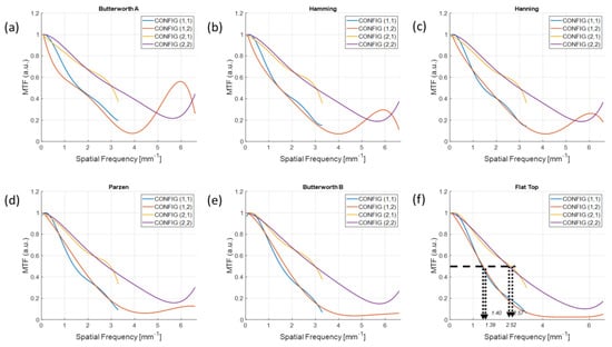 Modulation transfer functions (MTFs) for different filter schemes from the (a) Butterworth A, (b) Hanning, (c) Hamming, (d), Parzen, (e) Butterworth B, and (f) Flat Top windows with different configurations. The f50s measured in the images implemented with the flat top window were 1.39, 1.40, 2.52, and 2.57 lp/mm for the configuration (1, 1), (1, 2), (2, 1), and (2, 2), respectively.