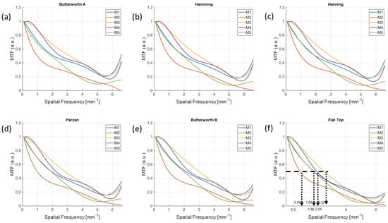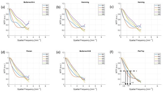 MTFs for different materials with the configurations (2, 2) using different filter schemes from the (a) Butterworth A, (b) Hanning, (c) Hamming, (d), Parzen, (e) Butterworth B, and (f) Flat Top windows. The order of f50s as a function of different materials was M3, M4, M1, M5, and M2.
