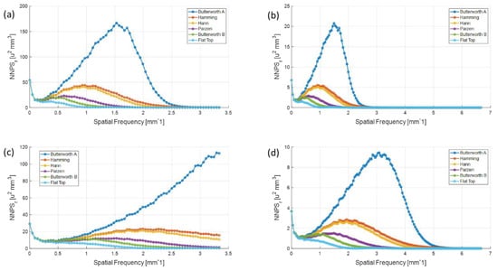 Radially averaged 1D NPS for each configuration from (a) (1, 1), (b) (1, 2), (c) (2, 1), and (d) (2, 2) with different filter schemes.