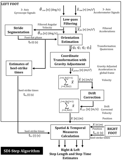 - Drift correction: Drift in the computed velocity was corrected using a zero velocity update algorithm [37]. The average amount of drift during the foot-flat phase was subtracted from the subsequent swing phase for each step to obtain the drift-corrected velocity.