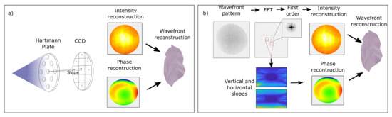 For the wavefront evaluation, two approaches were compared: the classical analysis of the centroids and the Fourier demodulation technique. A sketch of both methods is shown in Figure 3. The former measures the relative position change of the geometrical center of intensity for each pinhole in the Hartmann array in order to obtain an estimate of the local slope of the wavefront. The technique is well-known and has been used in a large number of laboratories for real-time beam characterization, laser-aberration description, and optics alignment [25,26,27]. The centroid method was specifically carried out with Imagine Optic software WaveView.