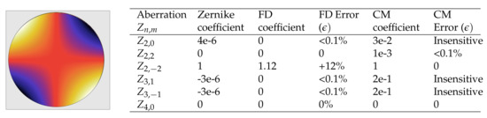The reliability of the centroid method (CM) and the inhouse FD script was validated using a simulated wavefront reconstruction. The test wavefront is shown in Figure 4, which contained a strong but not pure astigmatism degree. The table next to Figure 4 contains the corresponding Zernike coefficients for the simulated wavefront. The third and the fifth columns show the coefficients obtained through FD and the centroid method. Errors given for each aberration are shown on the right column next to each method. The FD-reconstructed wavefront took a numerical error of approximately 12%. On the other hand, the centroid method showed artificial numerical errors for high orders (, ). We considered these to be insensitive errors for reconstruction since the Zernike coefficients of the test wavefront were insignificant. In general, numerical errors can be attributed to the phase-unwrapping routine used within the algorithm. Wavefront-reconstruction methods are naturally very sensitive to the pupil definition, i.e., the size and position of each code, since phase slopes are recovered within that region, and Zernike coefficients are typically used for circular pupils [32]. Here, we call “the pupil” the circle that best covered the outer boundaries of the evaluated intensity pattern. Zernike polynomials are in principle only suitable for circular apertures; therefore, the pupil was the largest circle for which the measured phase difference was evaluated.