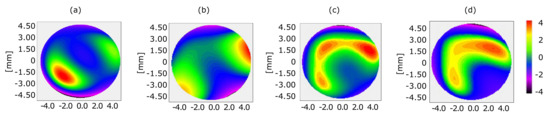 Figure 5 shows four cases of direct-beam wavefront recovery where similar circle areas were used, but a vertical shift moved the center of mass and therefore created new boundaries. Figure 5a shows the wavefront map reconstructed with a vertical shift of −10 pixels. Figure 5b shows the wavefront map of the same measurement, but the correctly reconstructed beam. Figure 5c shows the wavefront map reconstruction with a pupil defined with a shift of +10 pixels to an upper position. Central contribution was degraded, and the peak-to-valley phase became more abrupt. Figure 5d displays the wavefront with a +30 pixel shift, which corresponded to 5% of the pupil diameter.