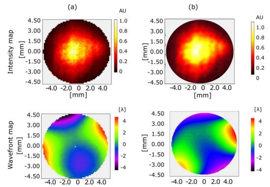 Again, disagreement between both wavefront maps, including with regard to peak to valley, may have originated from the selection of the pupil, as in the direct-beam case. When the pupil is not a circle, but rather a ring, the definition of the pupil becomes more complicated. Despite that, a circular and an annular pupil provide similar Zernike coefficients when the internal ring of the annular pupil becomes smaller, and its diameter tends to zero. Mahajan et al., and Guang-ming developed an analytical solution for those cases where central shadowing is pronounced [38,39]. In our specific case, during SO wavefront analysis, the Zernike polynomial for the vertical coma was approximately 0.28 μm when analysis was realized considering a circular pupil, and shrank to 0.16 μm for annular assumption.