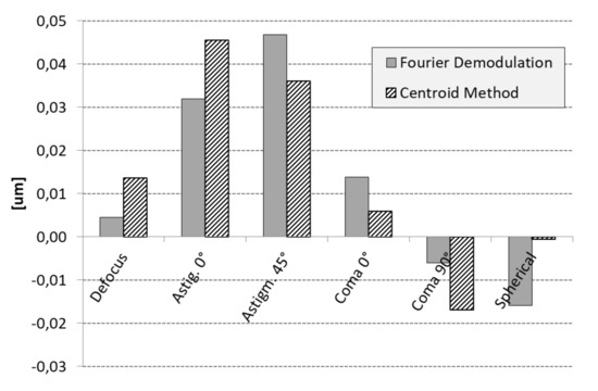 Thus, successful reconstruction of a wavefront with both methods relies on accurate definition of the pupil and a numerically stable phase-unwrapping algorithm. When the given conditions were met, the FD and centroid methods were benchmarked against the validation wavefront. A comparison of the FD and CM wavefront maps provides results that especially match qualitatively, since both reconstructions demonstrated robust recovery of the main aberration.