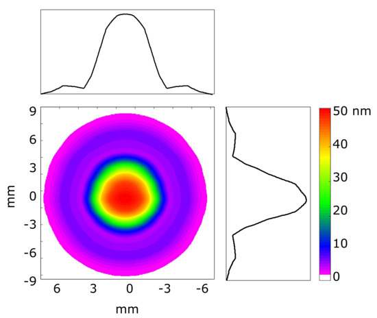 The largest aberration contribution is astigmatism. Former studies at FLASH [10,33] showed that FEL pulses contain residual aberrations. The astigmatism was possibly introduced by a combination of intrinsic aberrations from the generation of the FEL beam and distortions induced by the four plane beamline mirrors (two in the tunnel and two in the experiment hall). The plane mirrors directed the FEL beam from the undulator source to the beamline end of beamline FL21. WavePropaGator [34] was used to simulate the wavefront propagation of the beam (Figure 8); the simulation was highly precise. The residual slopes and the height profile of the mirrors were all measured at the Helmholtz Zentrum Berlin by F. Siewert et al. before installing them in the FLASH beamlines [35,36]. The profiles of the two plane mirrors in the tunnel were included in the wavefront simulation, as well as the correct distances between optical elements along the beamline. Calculations confirmed that small beam distortions that originated from the two plane beamline mirrors caused an elliptical beam size at the end of the beamline of 10.9 × 10.7 mm (4-sigma).
