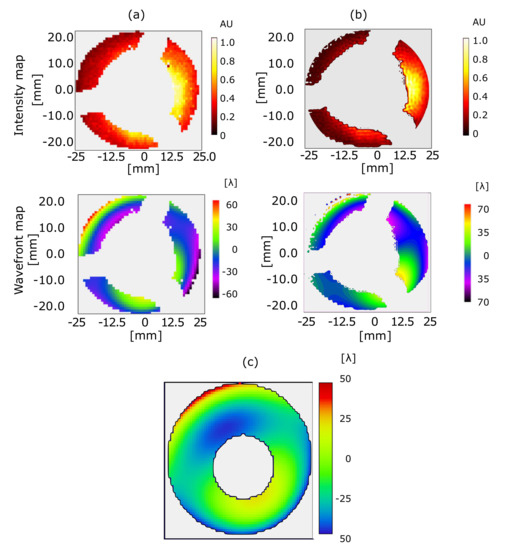 Figure 9 shows the intensity and wavefront maps analyzed by the centroid method and Fourier demodulation. Figure 9a shows obtained results using the WaveView software, and Figure 9b shows results from the FD method. The projection of the SO on the sensor was altered by changing the alignment between the convex and concave mirrors of the SO. The clear aperture of the beam was an ellipse of approximately 21 × 25 mm2. The pattern obtained a magnification of approximately 3×. In the intensity maps, the intensity’s center of mass was shifted slightly towards the right. Figure 9c shows the obtained wavefront map after simulating and performing misalignments of our setup in optical-design software Zemax [37]. A radial shift of about 1 mm between the centers of curvature of the convex and concave mirrors explained the large contribution of the vertical coma, shown in both CM and FD. This effect is shown in the green area at the bottom-right corner of the Schwarzschild wavefront map.